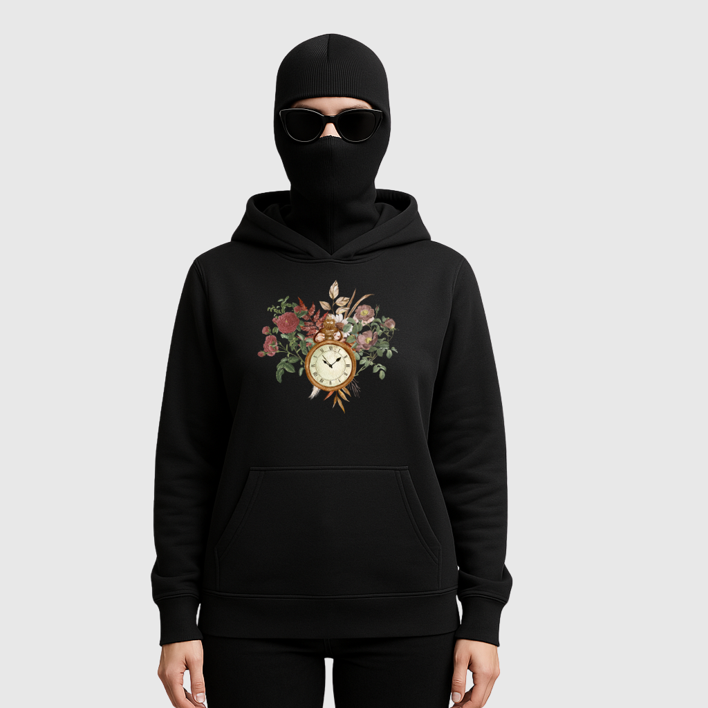 Czarna bluza z ilustracją zegara zatopionego w kwiatach to połączenie refleksji i stylu. Symbolika czasu, delikatności natury i przemijającego piękna wpisana w wygodną, miejską formę. To coś więcej niż ubranie – to przesłanie.